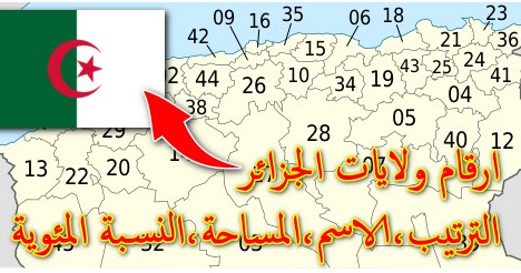 ارقام ولايات الجزائر الرمز البريدي و عدد الدوائر وعدد البلديات و المساحة وعدد السكان و الكثافة السكانية بالتفصيل